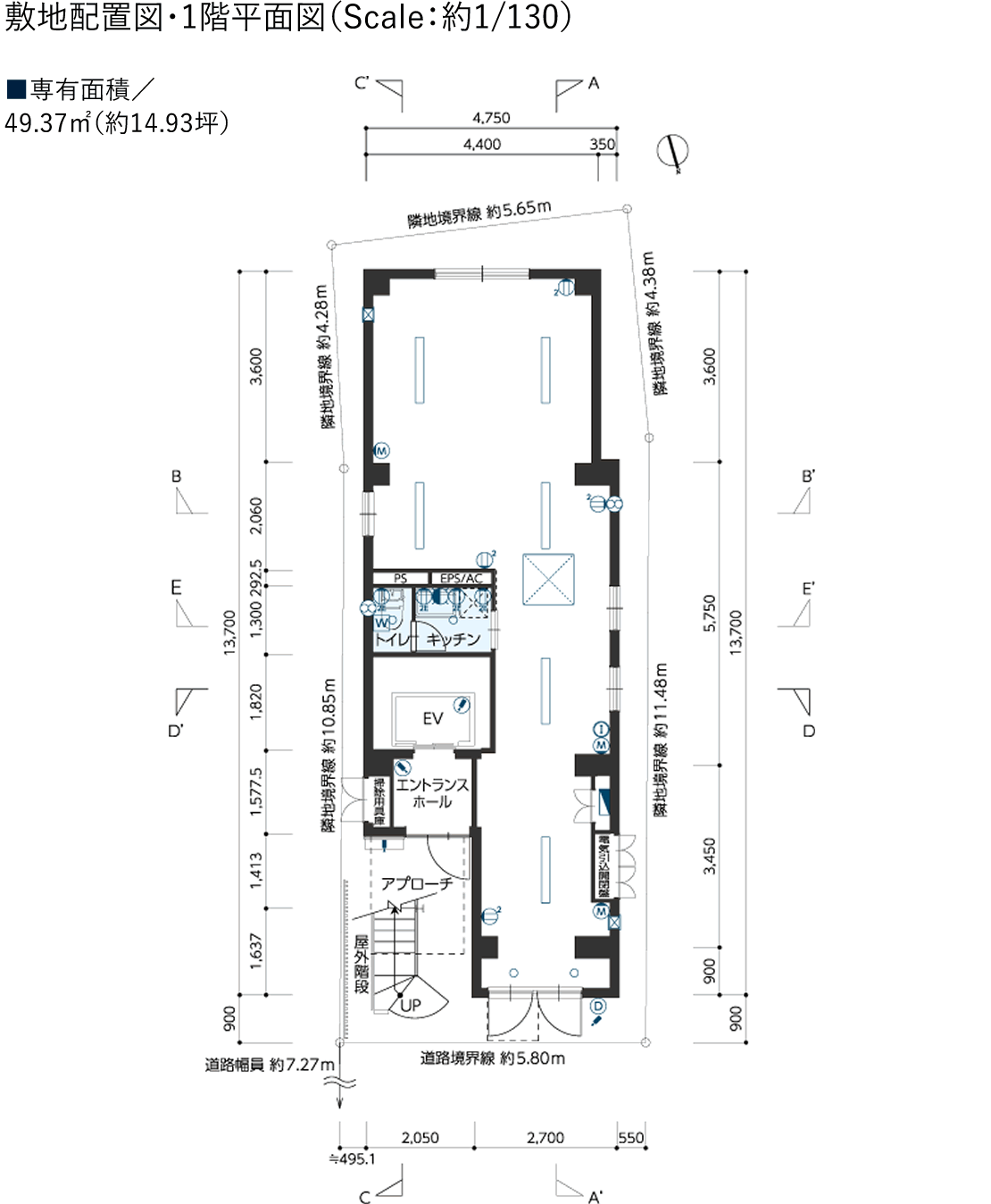 ●行政官庁の指導、施工上の都合および改良などの為、やむを得ず建物・外構の設計、仕様、寸法、コンセント、照明器具など設備の取付位置、形状などについては変更が生じる場合があります。予めご了承ください。(変更が生じた場合には竣工図面にて表示いたします) ●各図面での寸法単位は特記のない限り㎜で表示いたします。(施工上誤差が生じる場合がありますので予めご了承ください) ●方位記号は若干誤差が生じる場合がありますので、正確な方位については設計図書でご確認ください。 ●専有面積は建築基準法に基づく壁芯計算によります。従って登記上の内法計算による面積は若干減少します。 ●専有面積の中には室内パイプスペース(PS)、メーターボックス(MB)の面積が含まれております。 ●室内の段差表示は省略しています。 ●垂直避難口の位置につきましては設計図書をご確認ください。消防設備の保守・点検の為、係員が各室に立ち入る場合があります。 ●坪数換算はm2に0.3025を乗じた数値で表示しています。壁厚を含む面積となっていますのでご注意ください。(小数点第3位以下は切り捨て) ●平面図の設備記号は凡例をご参照ください。 ●室内部の壁・天井には設備用の点検口が設けられている箇所があります。(階数によって設置位置などは異なります)点検口などは省略しています。 ●コンセントなどの設備位置につきましては、施工上の都合などにより若干ずれる場合があります。 ●間取り図は基準階のものであり、階数により柱および梁の大きさは異なります。 ●縮尺率は印刷の都合上多少の差異が生じることがあります。